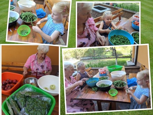 They also have enjoyed helping grandma cut beans and so that we can freeze them for the winter. We have had a great harvest of beans and tomatoes and cucumbers this year! We have also tried to learn a new method of preservation each year. The first year, we did jams (very simple), then we began to can tomatoes and fruits. Last year, we had enough tomatoes to last until late spring. We had enough fruits to make it the whole year! We added more tomatoes to can this year and we are hoping to make until we have fresh tomatoes next year. We also learned to blanch and freeze many vegetables that we were not able to can.