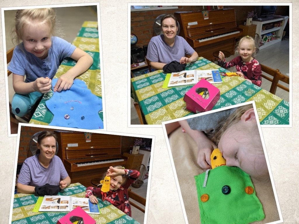 In addition to their school work, the girls love picking out songs on the piano. We hope we can find some lessons for them in the fall. They also love working with Katya and her mom learning how to sew.